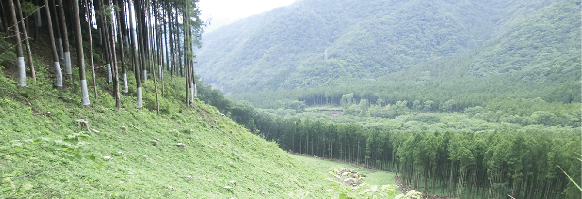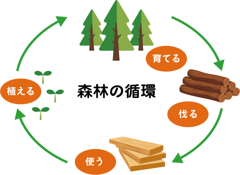 豊かな山林は、私たちにたくさんの恩恵をもたらしますが、 そのためには「木を育て、伐(き)り、使い、植える」という森林の循環と、間伐や伐採後の再造林等、 荒れた山林を作らないための管理が必要です。