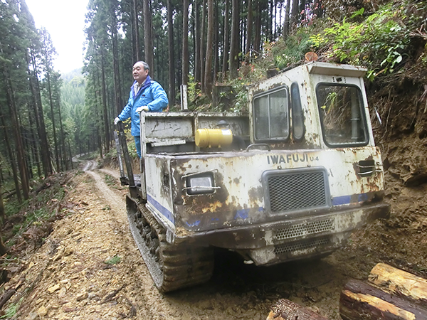 間伐後の視察。運搬車で山上まで移動中