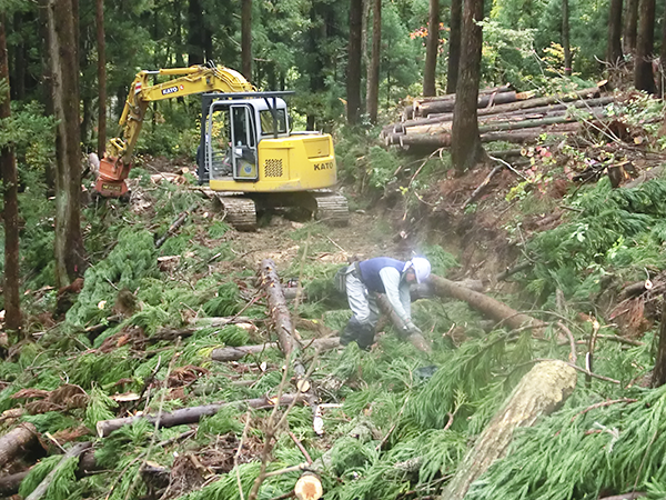 伐採した木を運搬車で運び集積。トラックで運搬する。