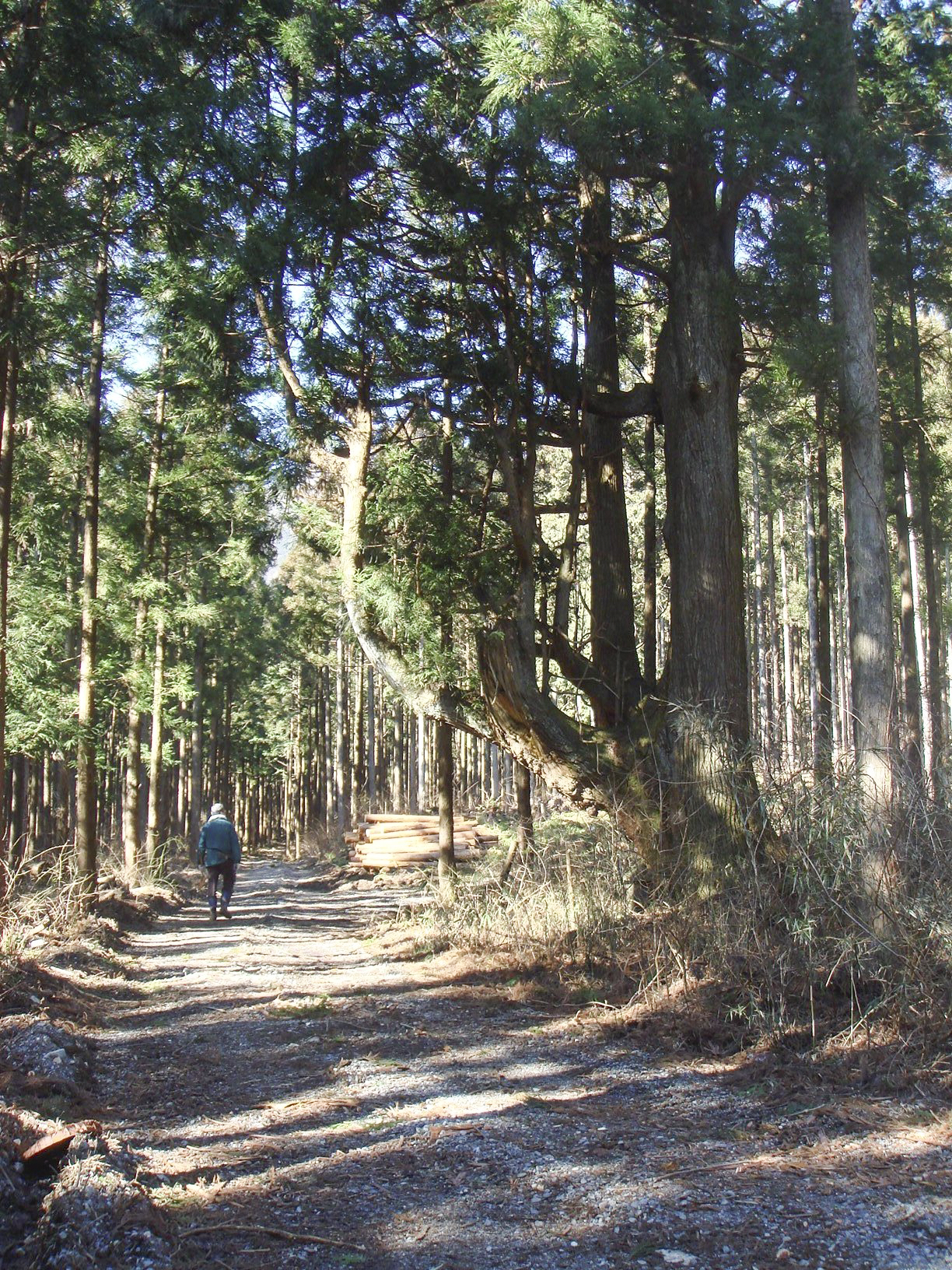 3本の幹が立っているが根本は1本の長年山林を見守ってきた立派な一本スギ。